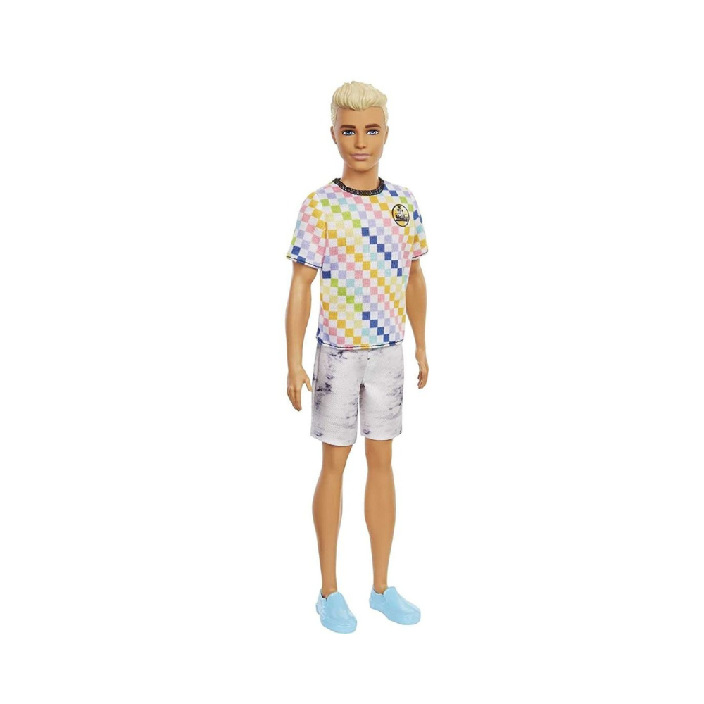 - Ken doll wears a checkered surf-inspired shirt and stone-wash denim shorts.