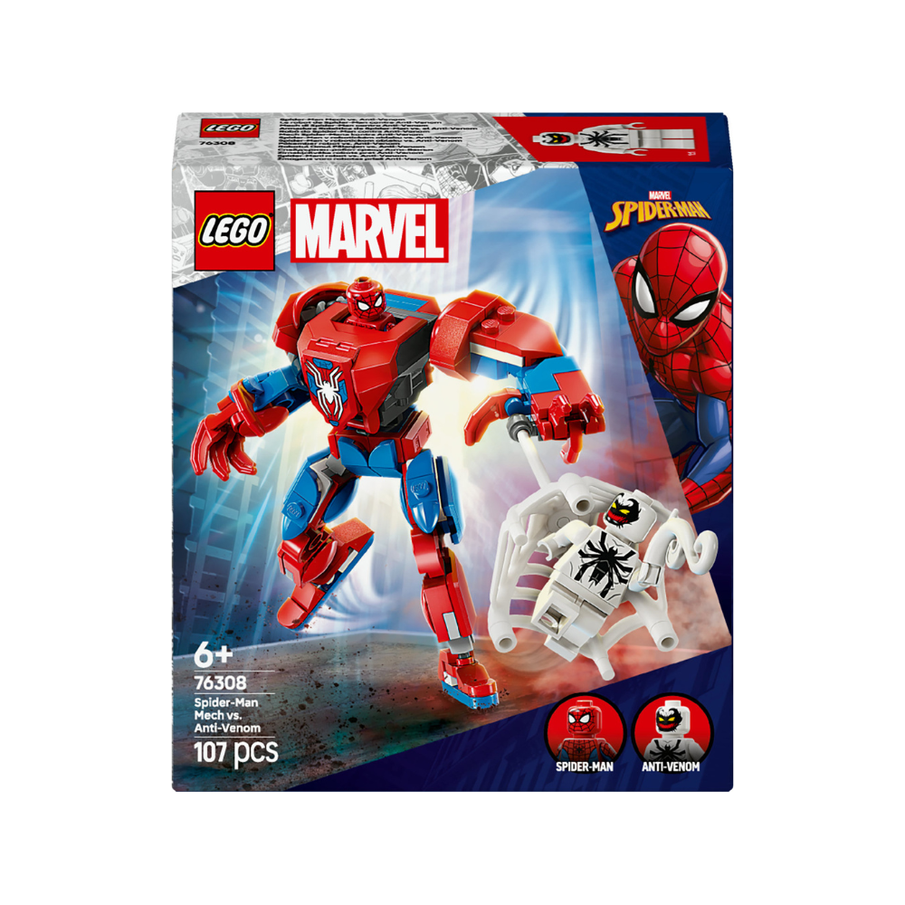 Spider-Man Mech vs. Anti-Venom (76308) is a fun LEGO Marvel building toy for 6 plus year old boys, girls and kids who love mechs, minifigures and Marvel-movie action. This premium-quality LEGO Marvel set will put endless imaginative adventures with a fully jointed buildable Spider-Man figure into the hands of young Super Heroes.