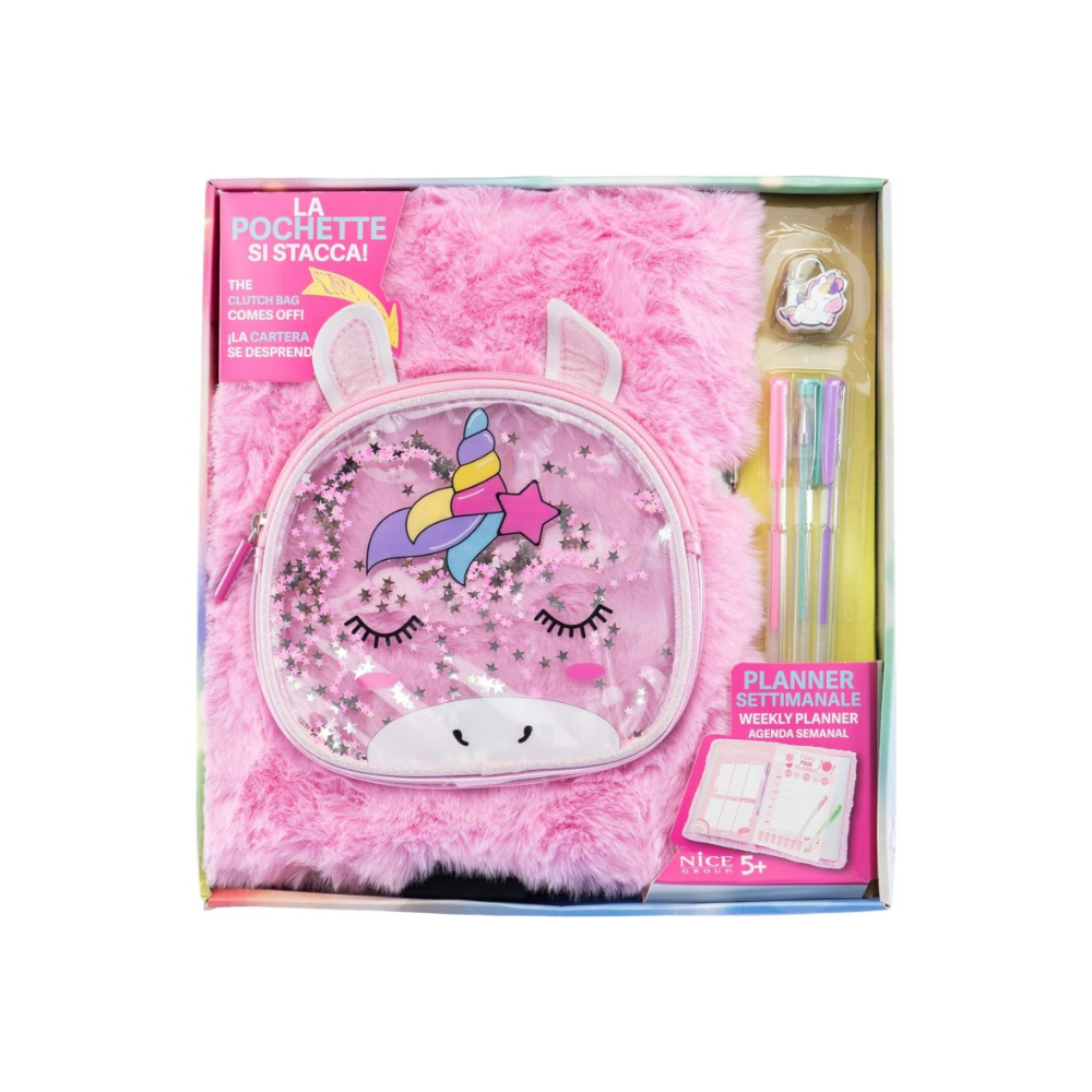 Magic unicorn notebook: delightful diary with padlock, with a soft and super fluffy cover, with a unicorn-shaped and designed envelope that can contain colored pens inside.