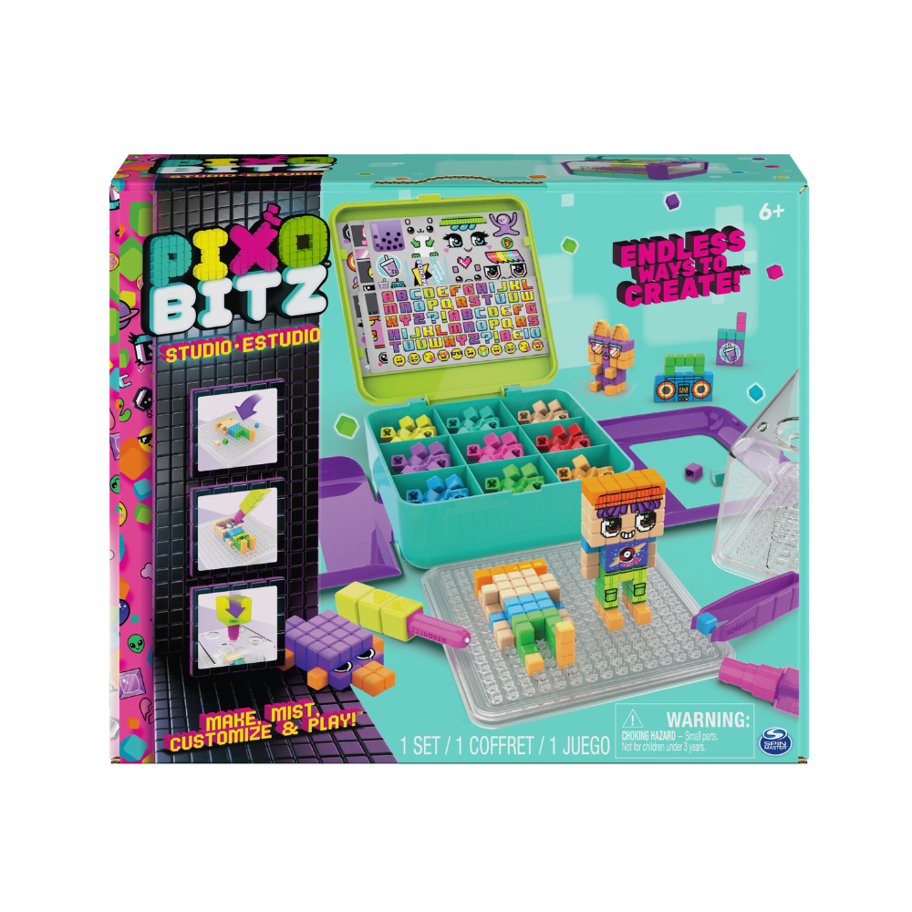 1 Pixobitz Studio with 4 tools (Misting Dome, PixoPlacer (Tweezers), 1 PixoMist n´ Stamp Penn, and PixoDeco Pen), 500 Pixobitz, 2 15x15 PixoTrays, 3 design templates, 3 water transfer deco sheets (over 100+ decos), 10+ accessory pieces