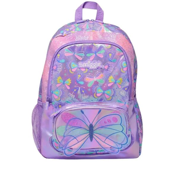 The Smiggle Flutter Butterfly Classic Backpack is a premium and enchanting bag from the brand's Flutter collection. Designed to capture the whimsical essence of butterfly-filled lavender fields, this backpack features a captivating combination of iridescent and glittery details.