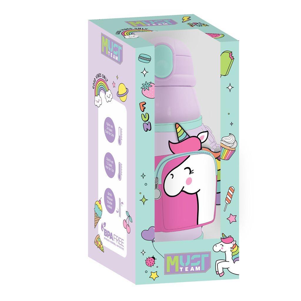 Vacuum Flask Stainless Steel Must Team Unicorn 500 ml with Isothermal case and straw, ideal for enjoying your favorite hot and cold drinks in the safest and healthiest way. Maintains temperature for hours, keeping drinks hot or cold. Includes practical isothermal fabric pouch with carrying strap and impressive small pouch for easy storage of small items. Ideal for school, trips and everyday use.