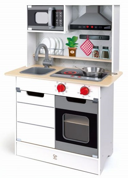 Unleash your child's inner master chef with the Hape Super Serve Kitchen Playset. This playset is designed to inspire young minds to create culinary masterpieces just like mom and dad! The kitchen playset includes pretend pots, pans, utensils, and all your little chef needs to create delicious pretend meals. The Hape Super Serve Kitchen Playset is not just a cooking station, but also an excellent platform to exercise creativity and imagination. With vibrant colors and a realistic design, it offers countless hours of exciting pretend play!